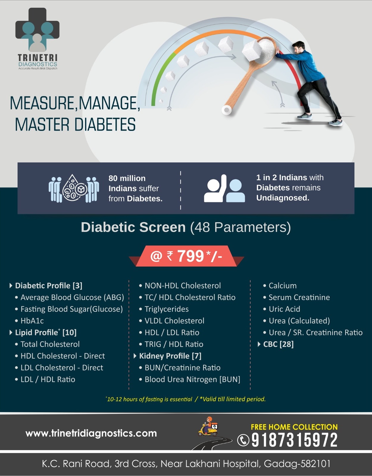 At Trinetri Diagnostics, we bring you a comprehensive Diabetic Screening Package (48 Parameters) at an affordable price of just βΉ799.
